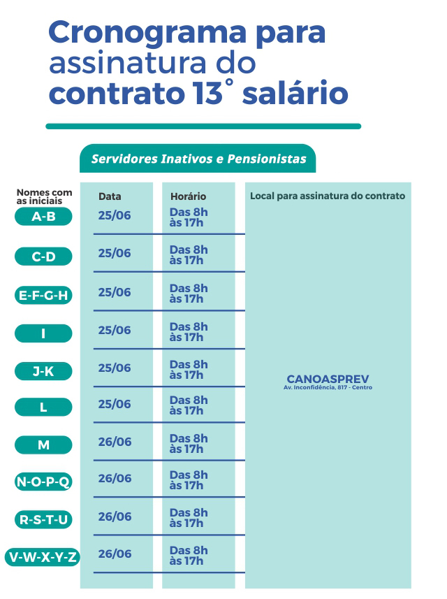 A Prefeitura de Canoas divulga o cronograma previsto de datas e locais para os servidores realizarem a adesão à antecipação da primeira parcela do 13º salário. Aqueles servidores, tanto ativos como inativos, que desejarem aderir à antecipação, deverão se dirigir aos locais nas datas informadas abaixo. O cronograma foi organizado de acordo com a letra inicial dos nomes dos servidores.